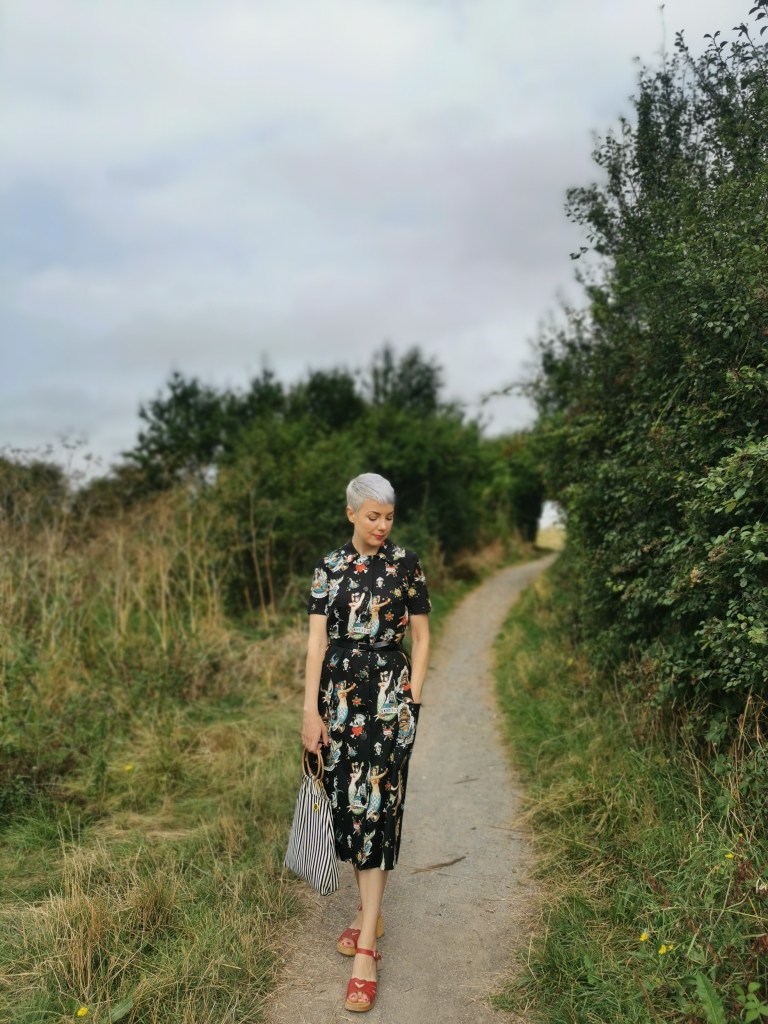 This is a pattern that I’m not really wearing in the intended way. Lyra is designed as a shirt dress with a loose waist and gathered skirt. The pattern artwork features lovely floaty viscose, which if you’ve been here for a while, you’ll know just isn’t for me (click here if you’d like to read about it!). Instead, I’m making the pattern as a shirt as it’s the PERFECT boxy preppy shirt, hurrah! All you need to do is extend the hem of the bodice by around 10cm, depending on the length you’d like, and extend the button placket by the same amount. A super simple pattern hack that creates a really cool shirt.